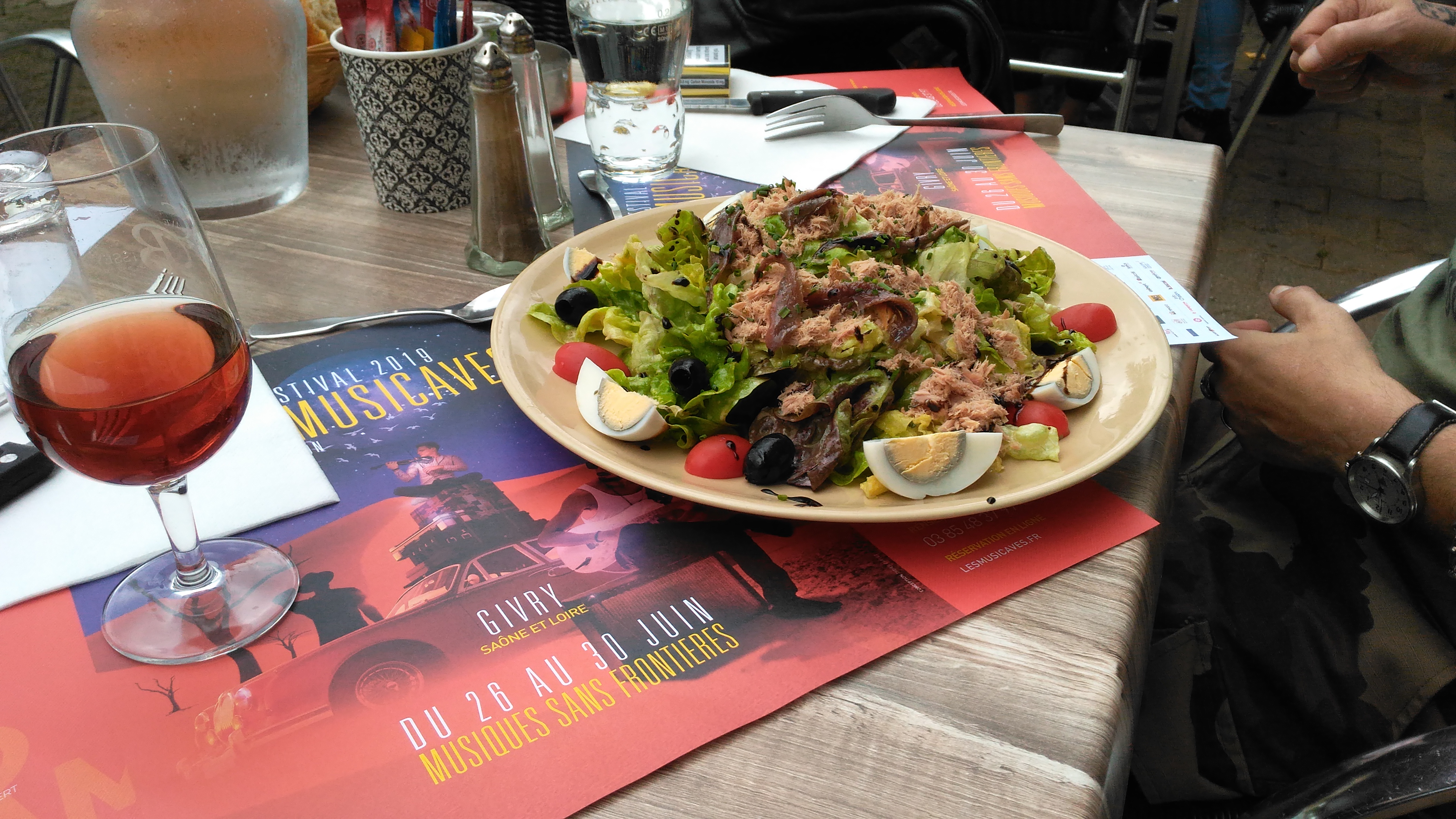 La brasserie du bar de la Croix Blanche propose juste un menu du jour unique du mardi au vendredi de 12h à 13h30. C'est frustrant pour ceux qui aiment passer des heures à hésiter sur une carte longue comme un jour sans pain, mais rassurant pour ceux qui préfèrent la simplicité et l'assurance de déguster un repas avec des produits frais et locaux. Ce jour là, pour 13 € avec café compris nous avons eu droit à un Gazpacho frais et goûtu digne des meilleures tavernes andalouses, à des filets de poulet fermier (en provenance directe du boucher voisin) accompagnés d'une ratatouille maison qui aurait fait fondre de plaisir Anton Ego et de röstis de pommes de terres fondantes et croustillantes. Une crème brûlée et un gâteau au chocolat pour conclure sur une note sucrée, voilà la recette toute simple du bonheur à un prix doux dans cette brasserie buxynoise qui mérite le détour, si vous avez la chance de découvrir cette belle région qu'est la Bourgogne !