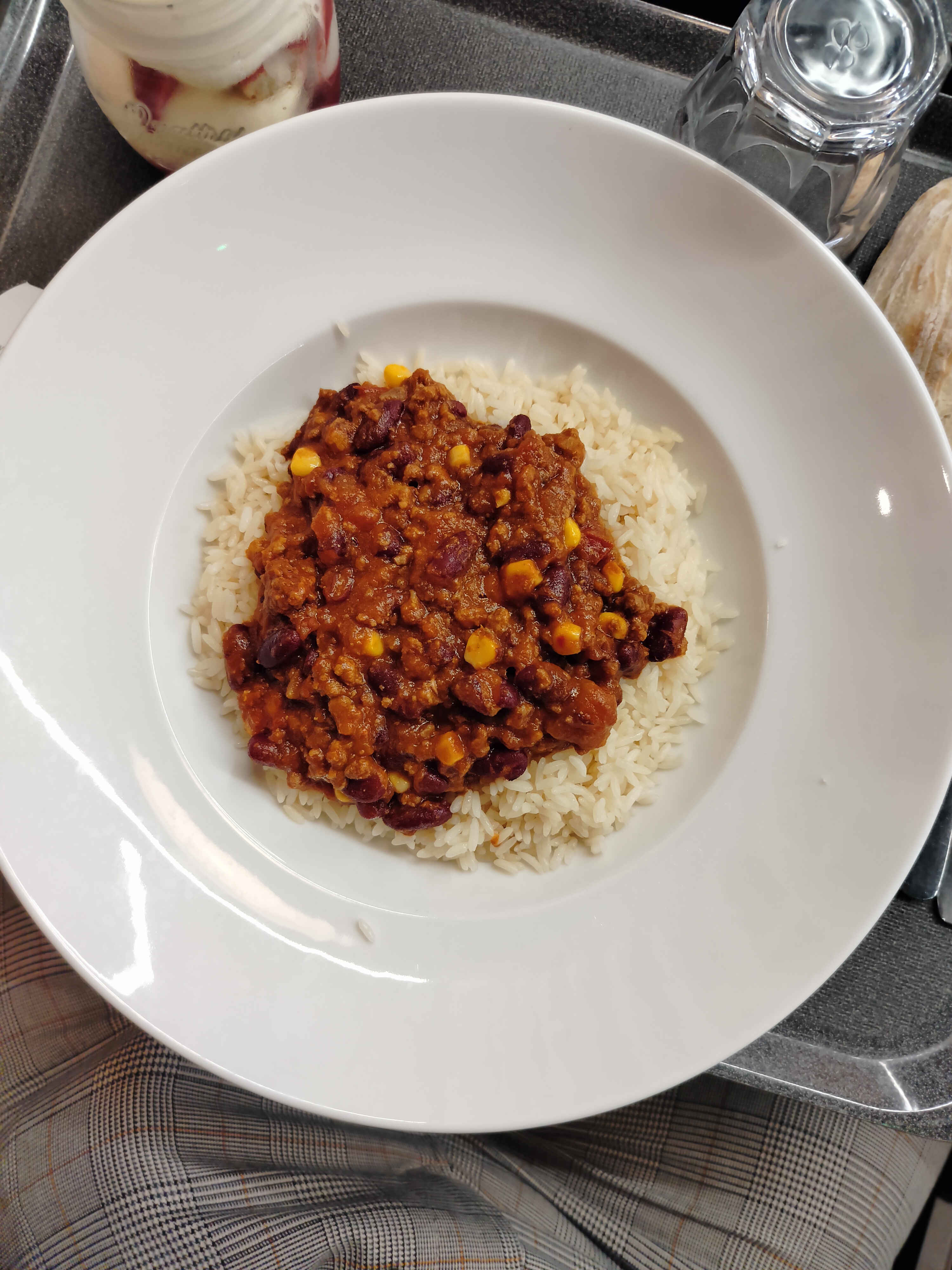 Je suis venu avec des amis, j'ai pris le repas du midi qui était un chilli con carne avec du riz qui était épicé. Et en dessert j'ai pris un tiramisu au fraise qui était très bon. J'ai trouvé le prix du repas avec le dessert qui était chère.