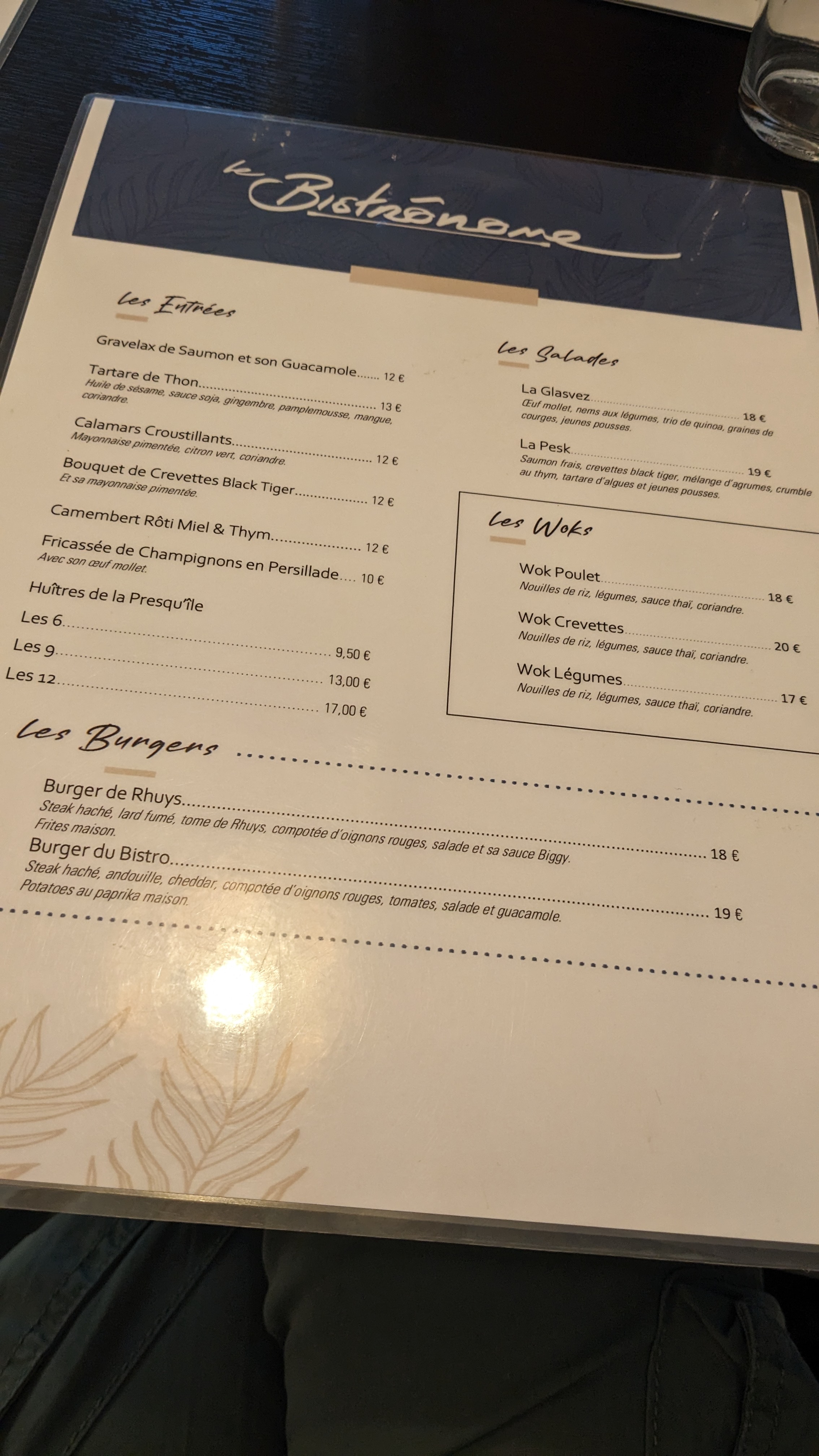 Nous sommes arrivés au Bistronome par hasard.. personnel sympathique...cependant, un verre de rose et un verre de rhum orange réglé 14,00 euros c'est dommage!!!.. la même consommation au bar restaurant du Roaliguen, 10,80 €, sans compter la vue sur la mer