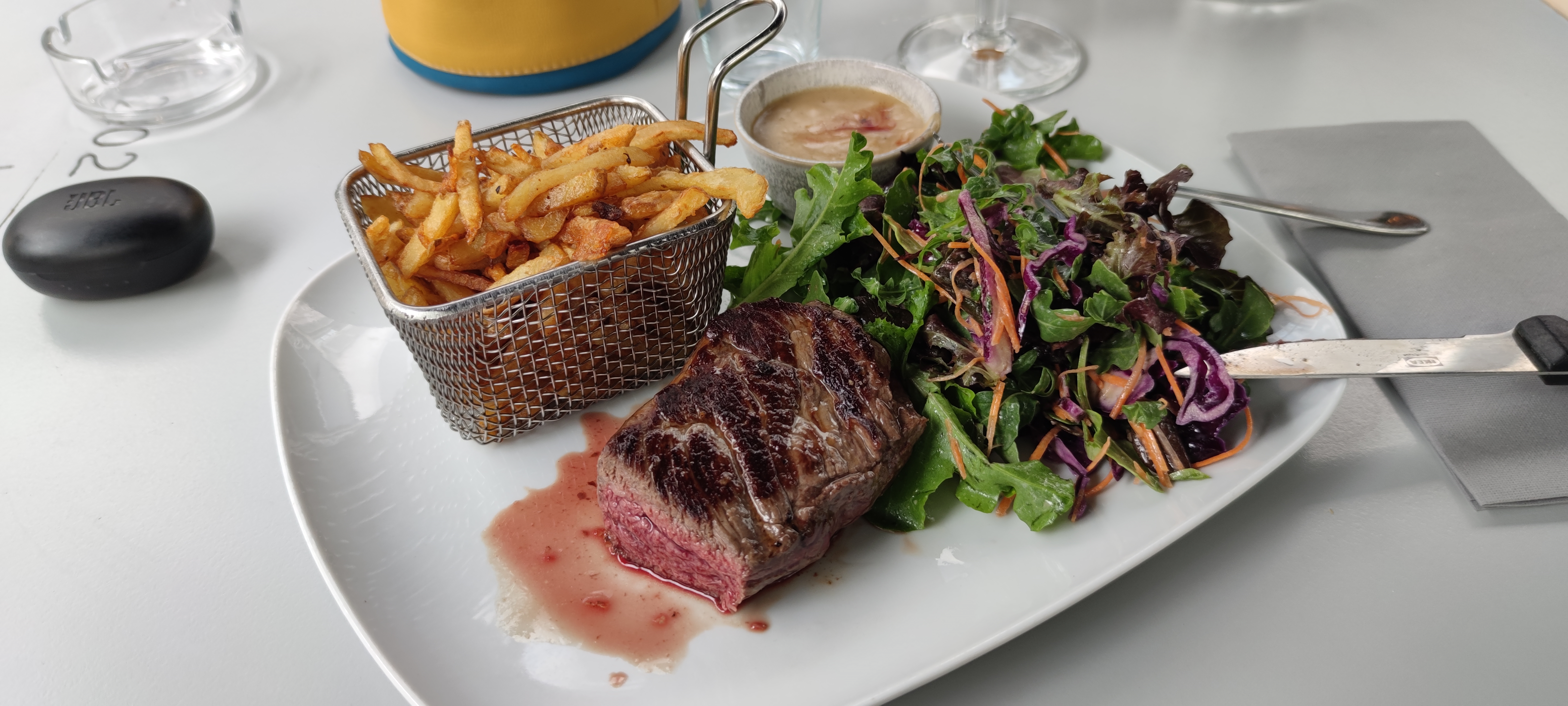 L'équipe a été super acceuillante , le repas était excellent ( respect des cuissons , temps de service très bon ), super située je recommande. Pièce du boucher , frites et salades :
