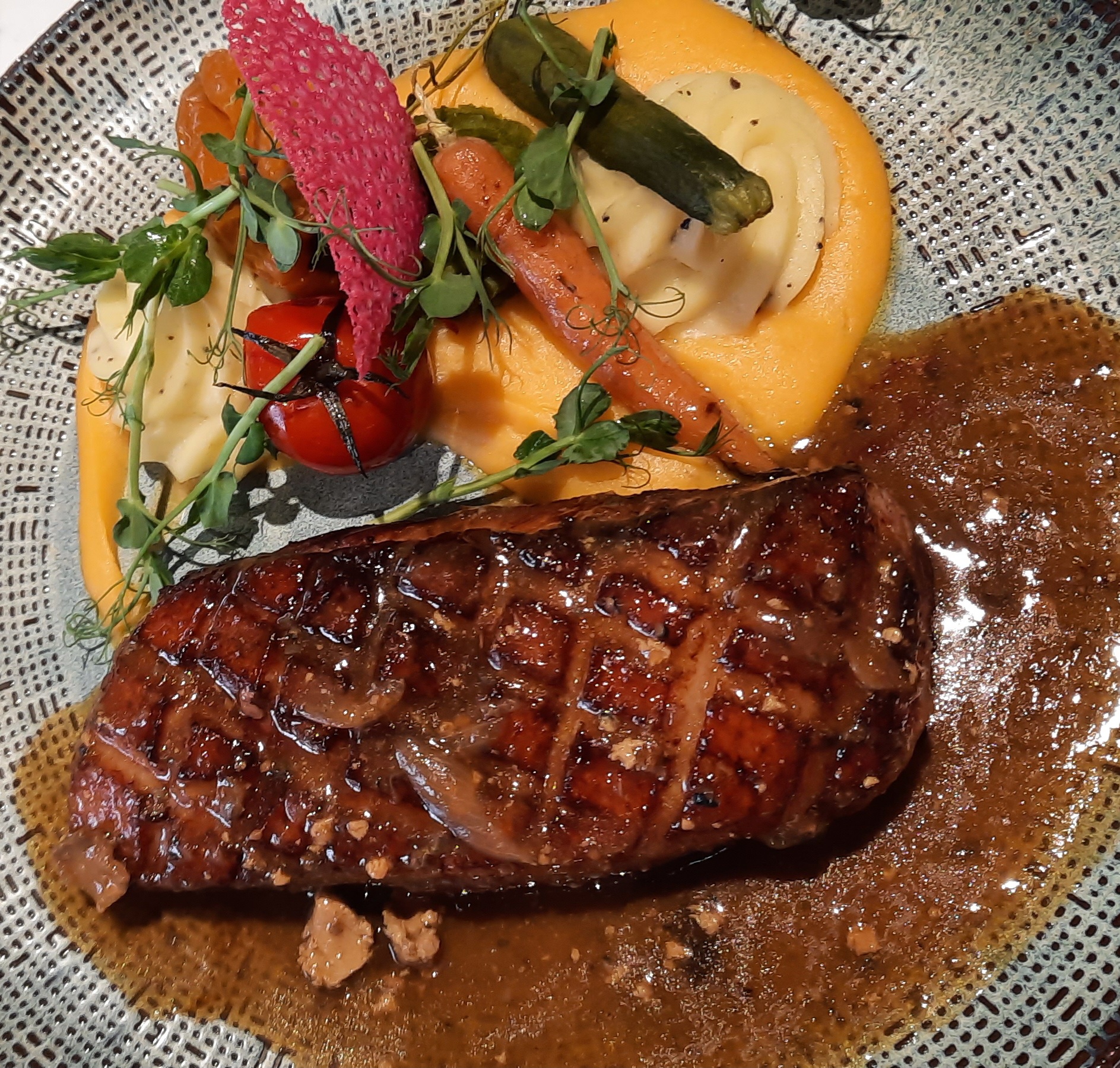 Ce restaurant est très bien agencé et propose une grande terrasse ombragée sur l’arrière avec une très belle vue sur la campagne périgourdine. On y est d’emblée très bien accueilli par la très sympathique et efficace équipe. Un chouette menu à l’excellent rapport qualité-prix est proposé le midi. Les plats sont très bien cuisinés à base de produits frais bien mis en valeur ; mention spéciale à l’excellente viande bovine, tendre et goûteuse à souhait. Une très belle adresse 👌🏼✨