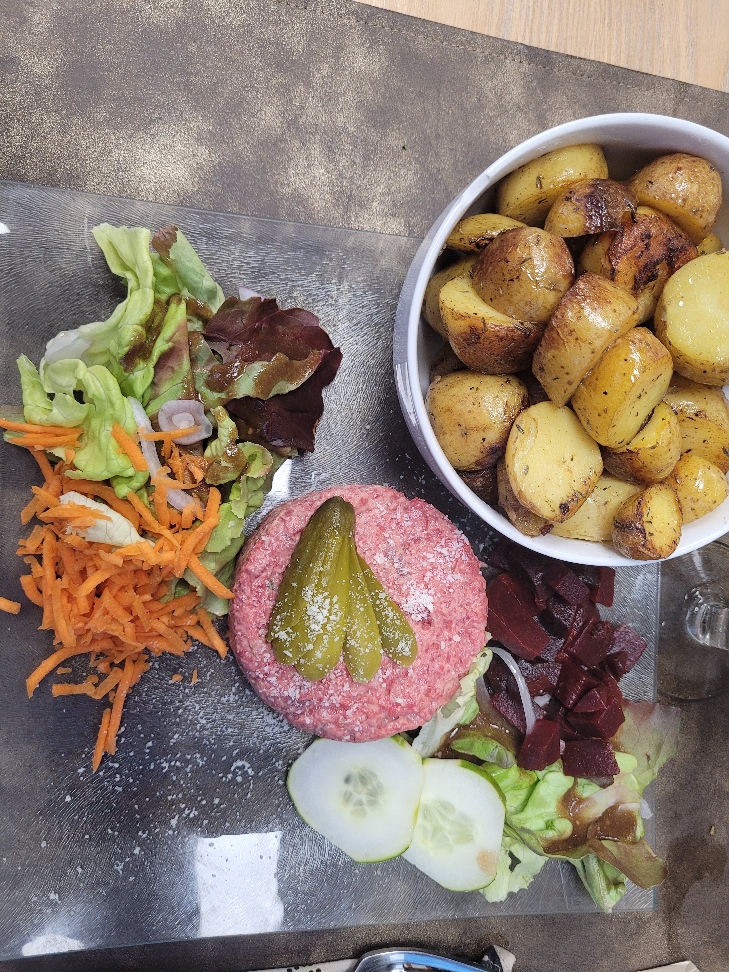 Découverte de la semaine. Mon père nous a emmené là et c'était vraiment très sympa. Il ne tarit pas d'éloge sur la propriétaire qui a quitté un emploi tranquille et bien payé pour ouvrir ce lieu. Vous vous rendez compte ! :) De fait, l'endroit est très bien pensé. L'accueil a été très chaleureux. JE suis végétarienne et on m'a tout de suite indiqué ce que l'on pouvait me préparer. Les plats étaient tous très bons que ce soit les végétariens ou la pièce de boeuf. Tout le monde est repartis content.