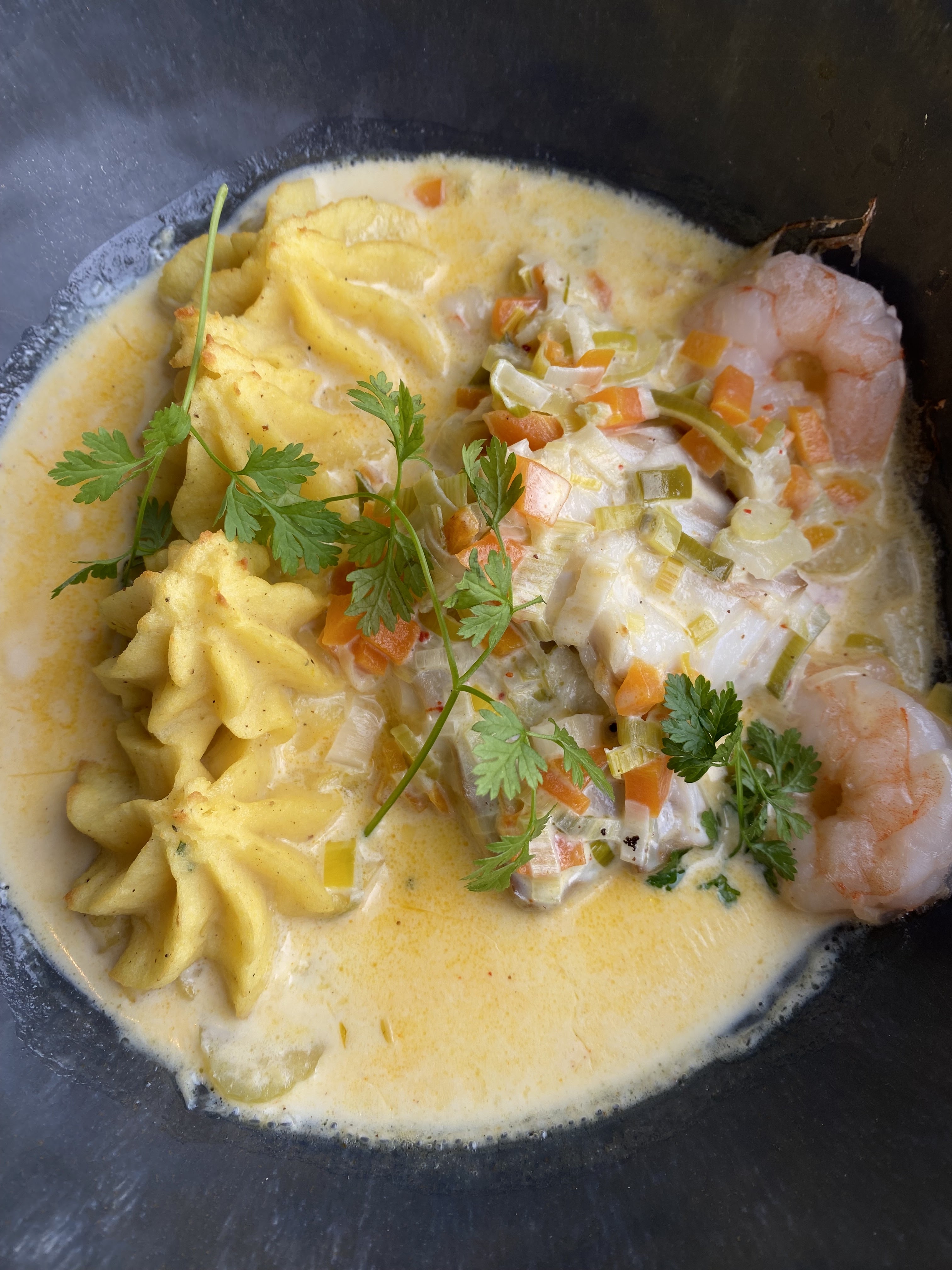Très déçue L'ancien restaurant était formidable et nous avions l'habitude d'y aller toujours au top Et là la douche froide quand on réservé devant notre surprise du changement de nom on nous a répondu pas d'inquiétude c'est toujours le même propriétaire.. À l'arrivée rien à voir avec l'ancien la deco bof la carte très simple et accueil froid mais on s'est dit on essaye Franchement pas top curry de crevettes beaucoup trop pimenté difficile de le manger tarte tatin insipide une simple tarte au pommes sans beurre ni caramel Et quand on a osé dire qu'on était pas satisfaits le responsable est devenu désagréable Très déçus et mauvais rapport qualité prix On n'y retournera pas