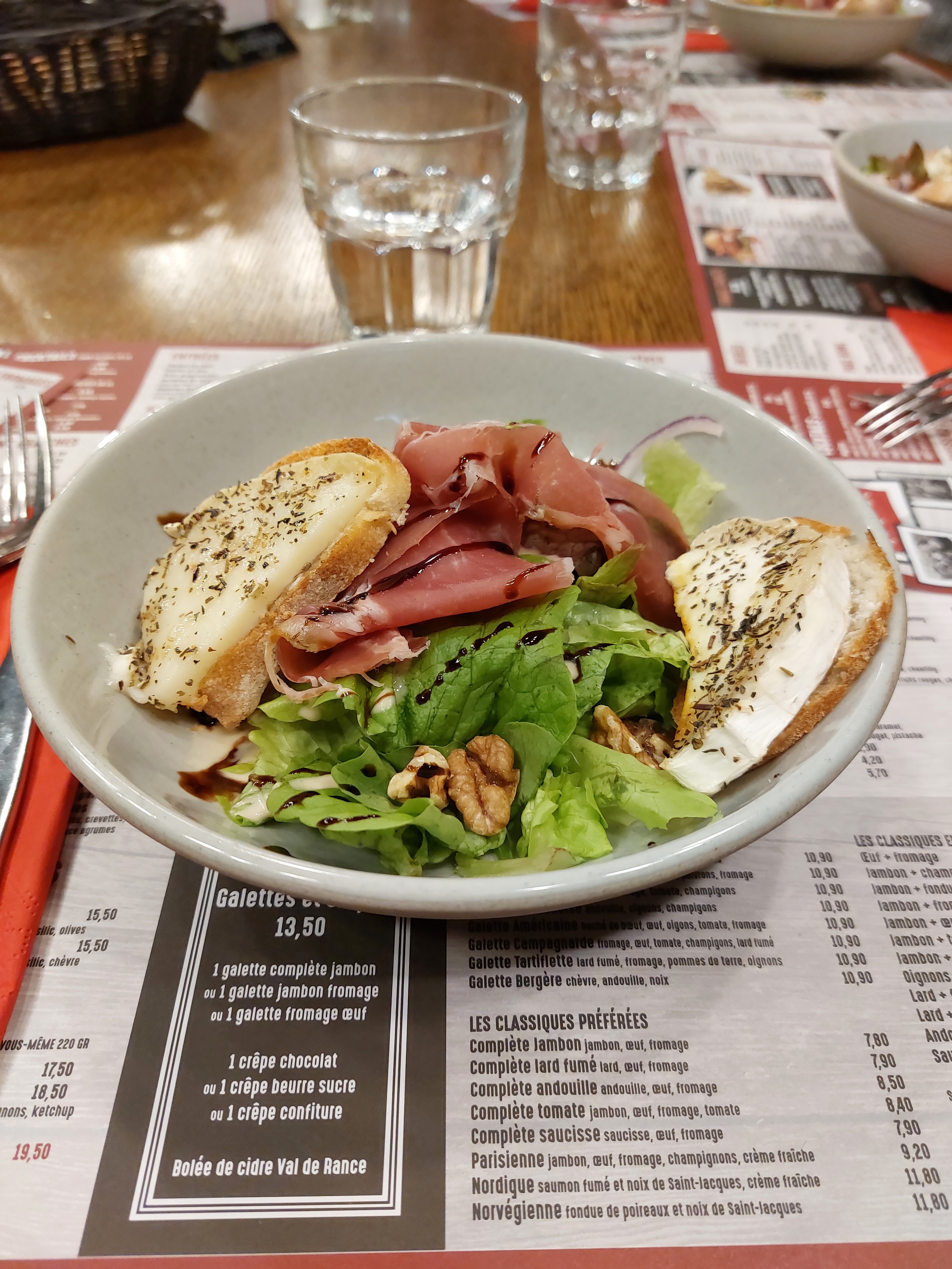J'ai pris le menu galettes: galette , crêpe et une bolée de cidre à 15,50€,il y a également entrée,plat, dessert du jour, dommage que le restaurant soit aussi bruyant,service rapide